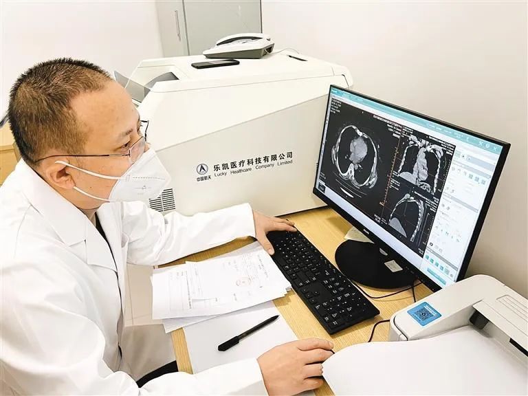 10日上午,在杜城社區(qū)衛(wèi)生服務(wù)中心診室門前,等候拍片的患者不多。在工作人員引導(dǎo)下,大家有序進(jìn)入拍攝區(qū)。診室內(nèi),陜西省康復(fù)醫(yī)院影像一科主任高雅鵬正在一個(gè)看似與普通顯示器沒什么兩樣的電腦前書寫診斷報(bào)告。“比起一般的CT靜態(tài)閱片,在這臺(tái)顯示器的幫助下,我們可以實(shí)現(xiàn)多角度、多方位、動(dòng)態(tài)式閱片,讓診斷更加細(xì)致精準(zhǔn)。” 高雅鵬說(shuō),這臺(tái)CT機(jī)的配置完全可以滿足周邊居民對(duì)于肺部CT的拍片需求。