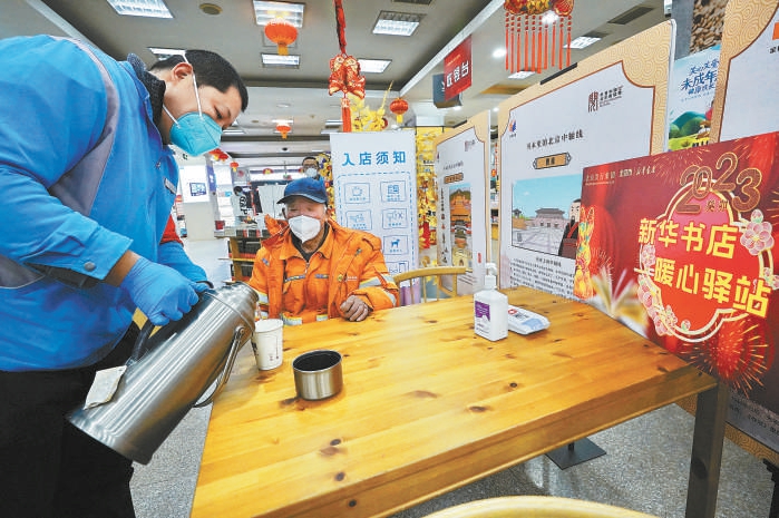 新華書店開設(shè)暖心驛站,為環(huán)衛(wèi)工人、快遞小哥等免費(fèi)提供熱水和休息場所。本報記者 程功攝