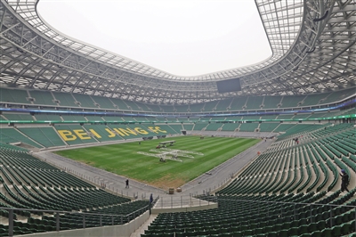 走進新工體項目區域,清灰色外立面的工人體育場在陽光下熠熠生輝,綠茵賽場整裝待發,看臺上環繞著寫有“北京國安”的綠色燈條。