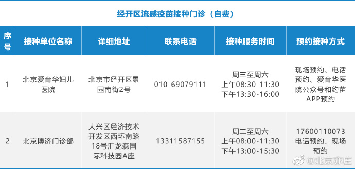 社會事業(yè)局相關負責人介紹,經開區(qū)將繼續(xù)采用提前預約方式開展自費流感疫苗接種工作。目前,經開區(qū)共設立北京博濟門診部、北京愛育華婦兒醫(yī)院兩個流感疫苗接種服務點,有接種需求的市民可提前向接種門診預約咨詢,可通過電話、現(xiàn)場登記、微信公眾號及其他網絡預約方式完成預約。