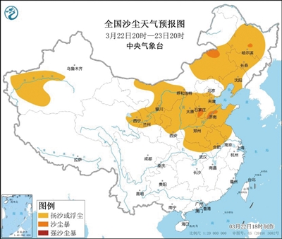 中央氣象臺昨日18時繼續發布沙塵暴黃色預警,受冷空氣大風影響,預計22日20時至23日20時,新疆西南部、內蒙古中西部和東南部、青海東北部、甘肅中部、寧夏、陜西中北部、山西、河北中南部、北京南部、天津中南部、山東、河南、安徽中北部、江蘇中北部、湖北北部、黑龍江中西部、吉林中西部、遼寧等地的部分地區有揚沙或浮塵天氣,其中,內蒙古中部偏北地區、黑龍江南部、河北西南部、山東西部局地有沙塵暴。