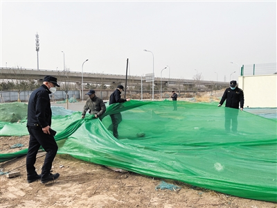 3月22日,石景山古城街道綜合行政執法人員來到轄區內工地,要求施工單位對裸露地面、渣土堆放場所及時苫蓋,施工期間進行灑水降塵,渣土運輸車輛確保清潔到位上路不遺撒,從源頭杜絕揚塵污染源的發生。新京報記者 浦峰 通訊員 王亞楠 攝