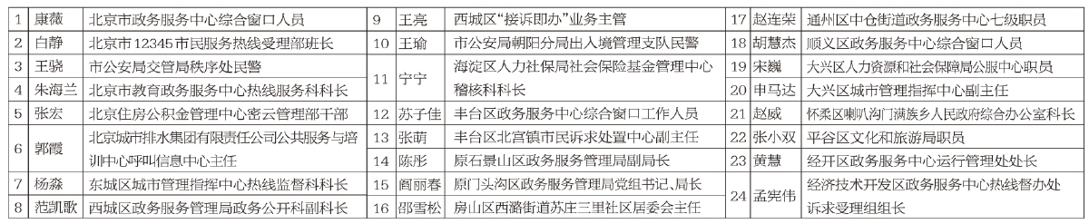 2019年起,市政務服務管理局聯合首都文明辦連續開展了四屆“北京榜樣·政務服務之星”主題活動,經各單位層層推薦、從嚴把關,累計評選出80名“政務服務之星”、107名提名獎和450名“貼心服務標兵”,其中12名同志榮登“北京榜樣”年榜、月榜和周榜。這些評選對象涉及市、區、鎮街三個層級,政務服務、政務公開、市民熱線、人力社保等十多個行業和領域。