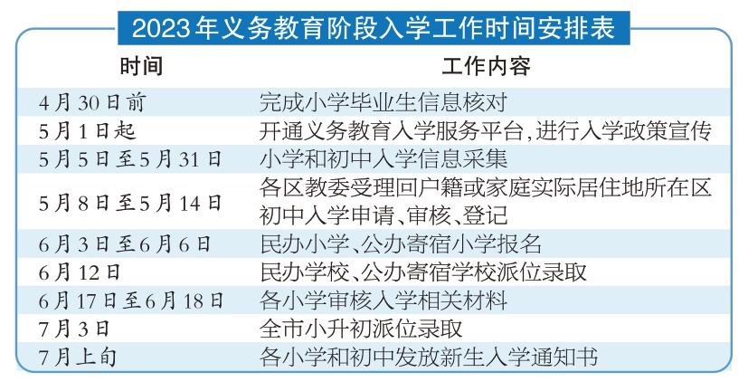4月30日前,本市將完成小學畢業生信息核對;5月1日起,義務教育入學服務平臺開通,進行入學政策宣傳;5月5日至5月31日,進行小學和初中入學信息采集。