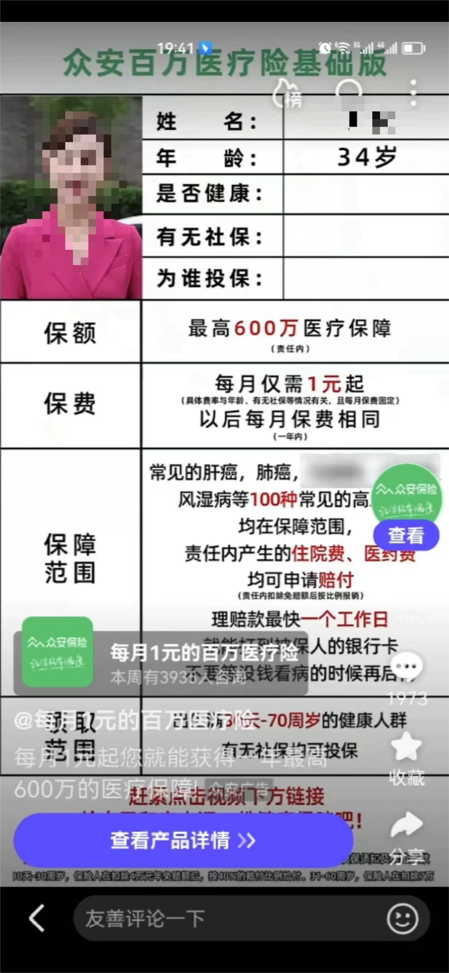 眾安保險在視頻廣告上稱每月保費1元起(央廣網(wǎng)發(fā) 記者截圖)