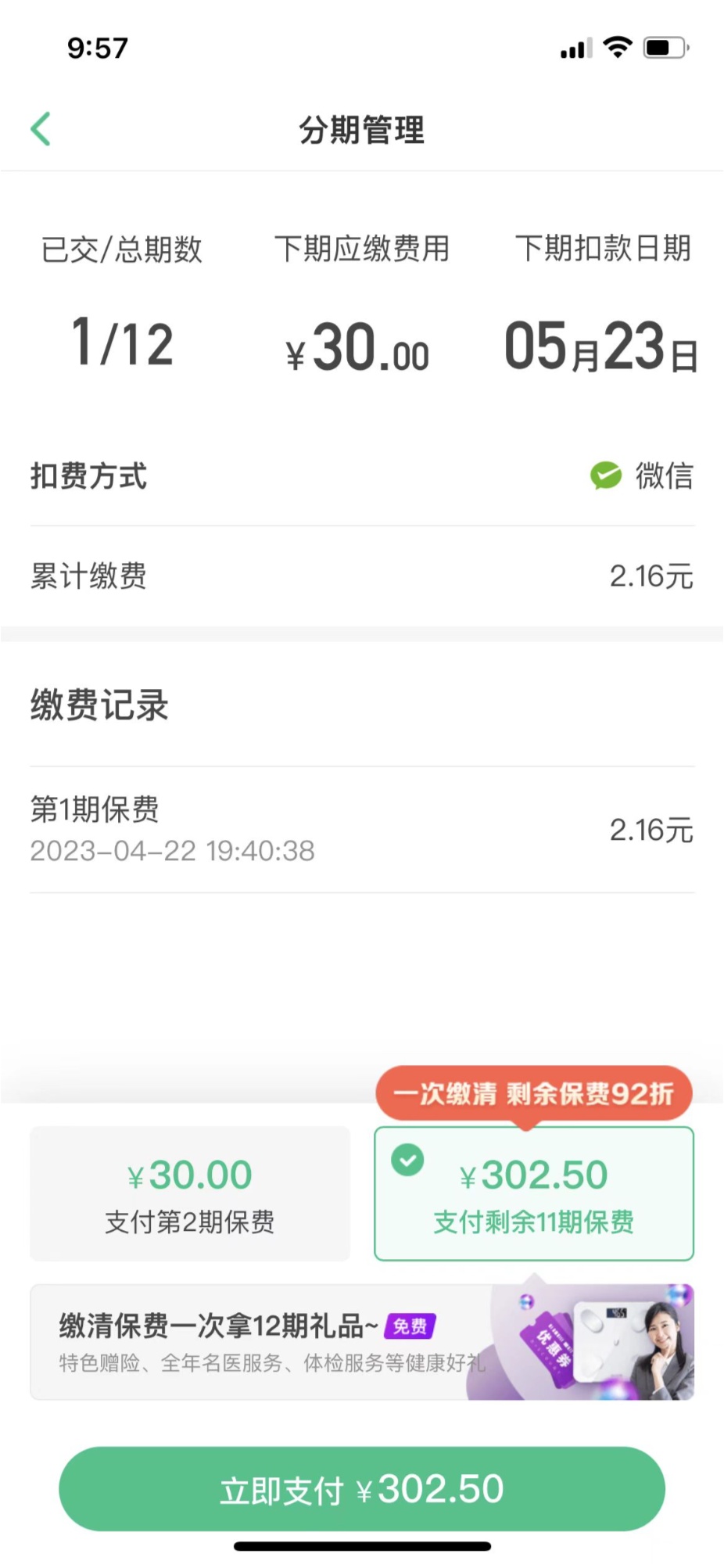記者在眾安保險App的保單頁面中看到,所購保險名為“眾安百萬醫(yī)療保險2022版”,點擊保單頁中的“去繳費”選項,該保單為期一年,目前累計繳費2.16元,但下期應(yīng)繳費用已變?yōu)?0元。