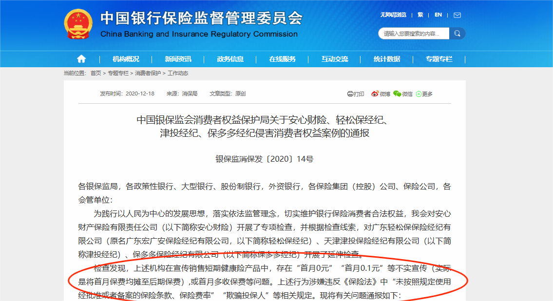 2020年,中國銀保監(jiān)會消費者權(quán)益保護局發(fā)布關(guān)于安心財險、輕松保經(jīng)紀(jì)、津投經(jīng)紀(jì)、保多多經(jīng)紀(jì)侵害消費者權(quán)益案例的通報。通報稱檢查發(fā)現(xiàn),上述機構(gòu)在宣傳銷售短期健康險產(chǎn)品中,存在“首月0元”“首月0.1元”等不實宣傳(實際是將首月保費均攤至后期保費),或首月多收保費等問題。上述行為涉嫌違反保險法中“未按照規(guī)定使用經(jīng)批準(zhǔn)或者備案的保險條款、保險費率”“欺騙投保人”等相關(guān)規(guī)定。