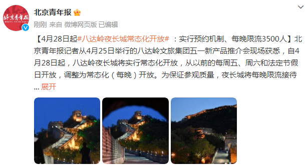 4月28日起八達嶺夜長城常態化開放:實行預約機制、每晚限流3500人