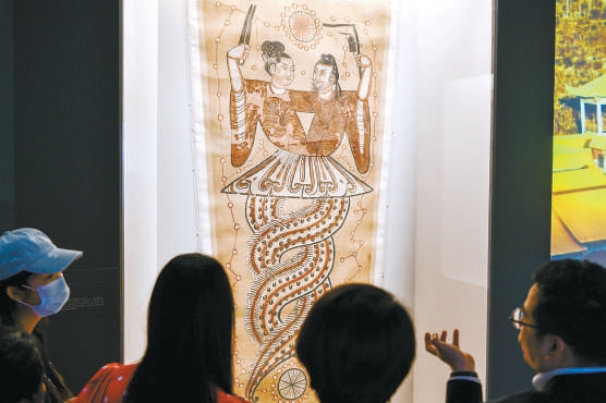 “交融匯聚——新疆精品歷史文物展”近日在國家博物館開幕。展覽展出新疆精品歷史文物209件(組),展現(xiàn)新疆各民族交往交流交融的歷史事實(shí)。圖為觀眾欣賞伏羲女媧絹畫。 本報(bào)記者 鄧偉攝