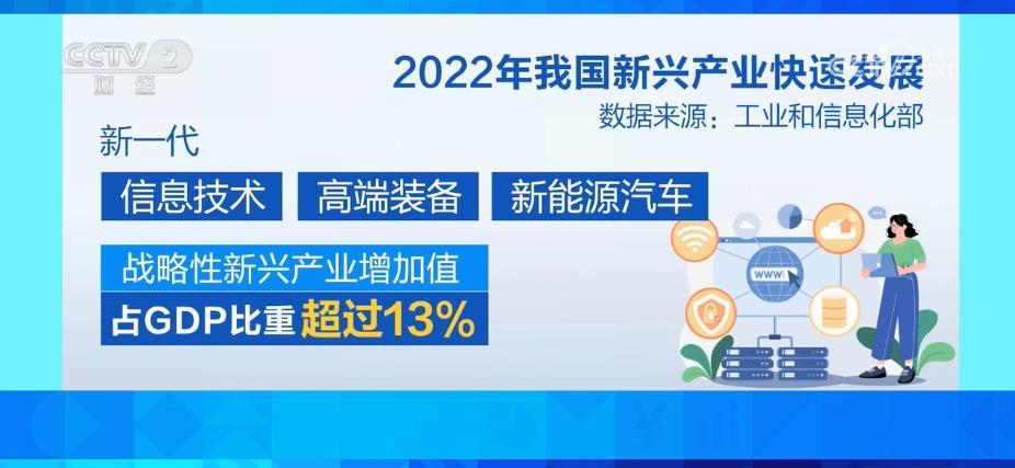工業和信息化部部長金壯龍介紹,2022年,我國新一代信息技術、高端裝備、新能源汽車等戰略性新興產業增加值占GDP比重超過13%。