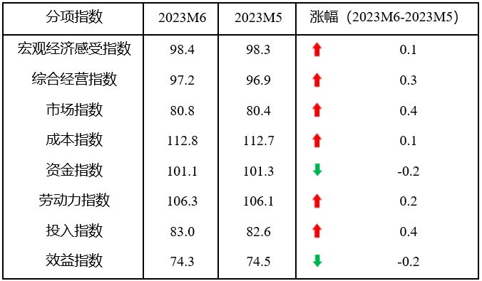 從分項指數看,6月份,8個分項指數6升2降,宏觀經濟感受指數、市場指數、成本指數和投入指數止跌回升,綜合經營指數由平轉升,勞動力指數連續兩個月上升,資金指數和效益指數由升或平轉降。