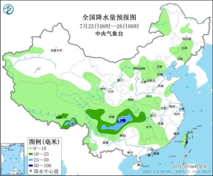 7月25日08時至26日08時,四川西部和南部、重慶大部、湖北西南部、湖南西北部、貴州北部、云南東北部、西藏東南部、臺灣島東部等地的部分地區有中到大雨,局地有暴雨(50~80毫米)(見圖3)。新疆南疆盆地、浙江東部等地的部分地區有4~6級風。