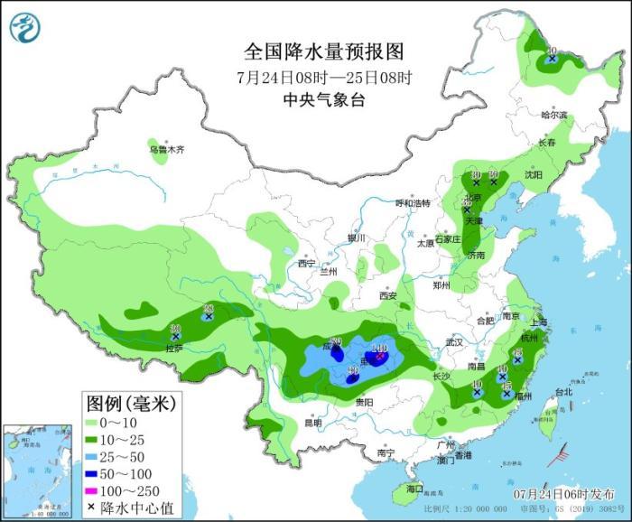 預計,7月24日08時至25日08時,四川盆地中南部、重慶大部、貴州北部、云南東北部、湖北西南部、湖南西北部以及浙江南部、福建中北部、江西南部、黑龍江北部、西藏東部等地部分地區有大到暴雨,其中,重慶南部等地局部地區有大暴雨(100~140毫米)。上述部分地區伴有短時強降水(最大小時降雨量30~50毫米,局地可超過70毫米),局地有雷暴大風等強對流天氣。中央氣象臺7月24日06時繼續發布暴雨藍色預警。