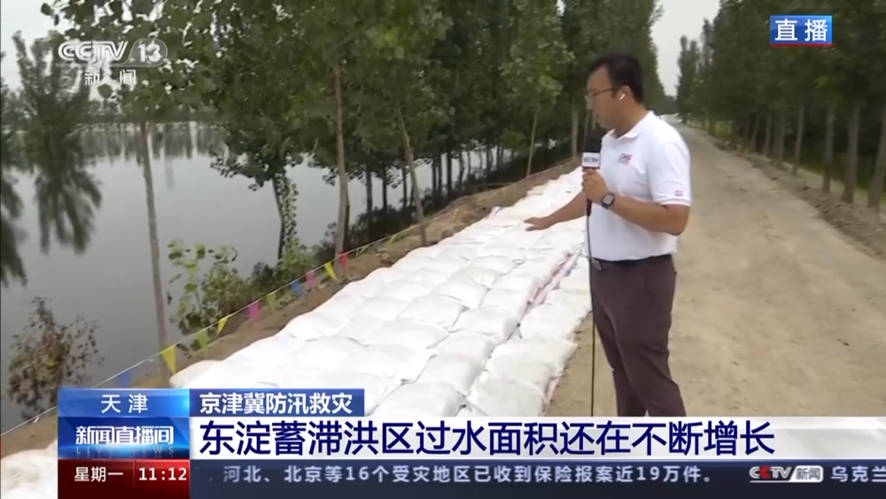 總臺央視記者 黃達:我現在所在的位置是靜海區臺頭鎮的圍埝上。截至今天9時,大清河水位相較昨天同一時間上漲0.4米。目前水位還在繼續上漲,距離圍埝的頂端還有1米左右的距離。