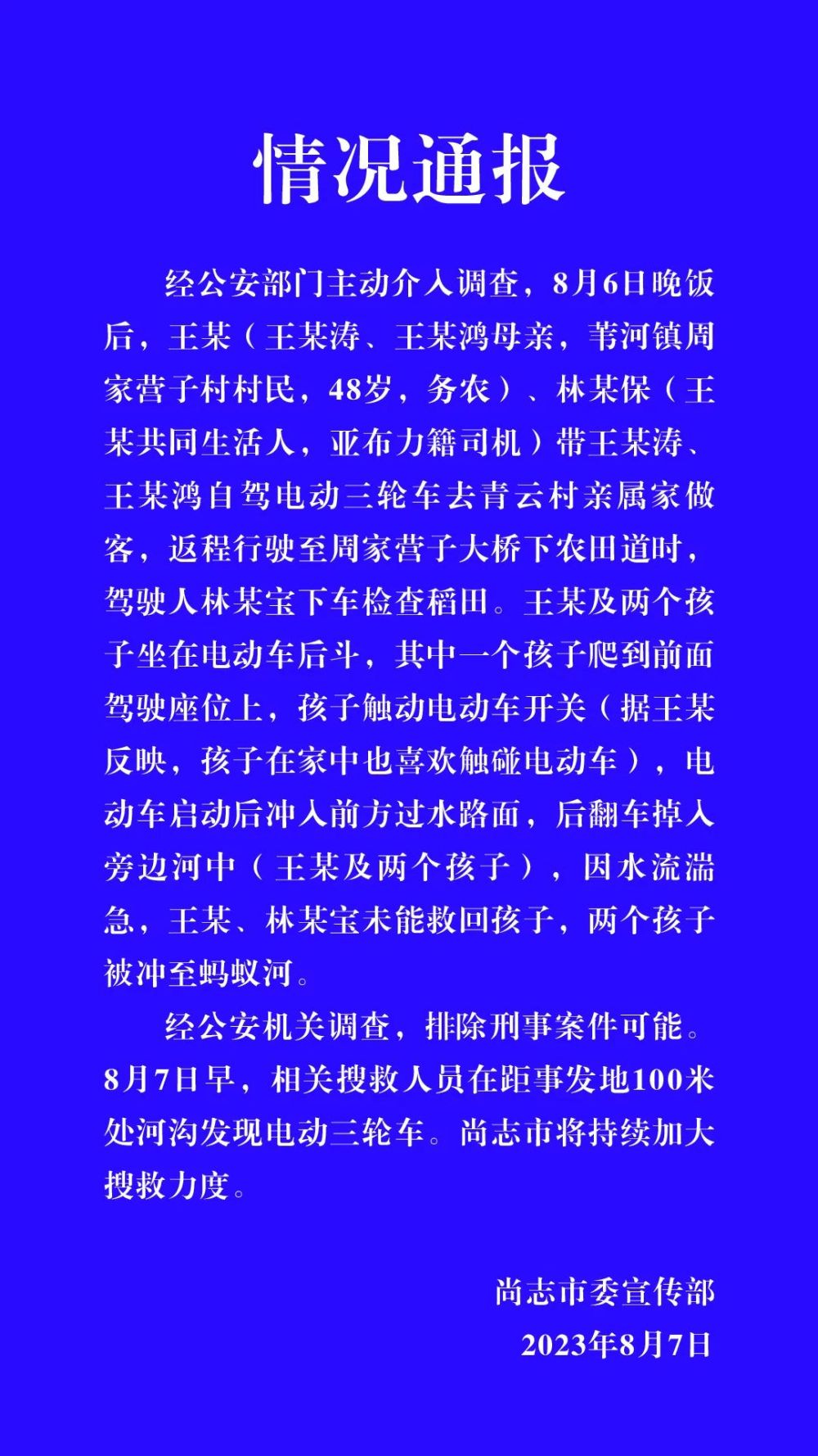 中新網8月8日電 據尚志市委宣傳部微信公眾號消息,經公安部門主動介入調查,8月6日晚飯后,王某(王某濤、王某鴻母親,葦河鎮周家營子村村民,48歲,務農)、林某保(王某共同生活人,亞布力籍司機)帶王某濤、王某鴻自駕電動三輪車去青云村親屬家做客,返程行駛至周家營子大橋下農田道時,駕駛人林某寶下車檢查稻田。王某及兩個孩子坐在電動車后斗,其中一個孩子爬到前面駕駛座位上,孩子觸動電動車開關(據王某反映,孩子在家中也喜歡觸碰電動車),電動車啟動后沖入前方過水路面,后翻車掉入旁邊河中(王某及兩個孩子),因水流湍急,王某、林某寶未能救回孩子,兩個孩子被沖至螞蟻河。