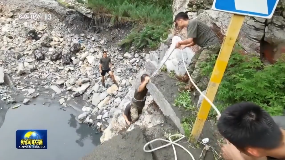 某抗洪搶險應急通信保障任務分隊指揮員 于林平:準備上去的時候,下面的那個路突然塌方了,我整個人就像吊單杠一樣,整個給我拉直了,然后我的戰友把我拉上來了。下面全部是碎石,水流非常湍急,非常有可能會被沖下去。