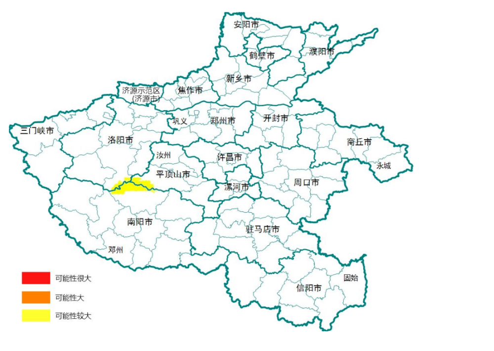 縣(市)地質災害氣象風險黃色預警區域包括洛陽、平頂山、南陽等3個省轄市,3個縣。具體為:洛陽嵩縣,平頂山魯山縣,南陽南召縣,這些地區發生地質災害的可能性較大。
