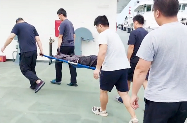 經過綜合研判,船長康宜群決定立即放下吃水淺且航速快的船上小艇,克服涌浪帶來的困難,快速駛向求救漁船。9海里的距離,小艇僅用20分鐘便順利接到傷員,并第一時間送至呂四港2+2碼頭。