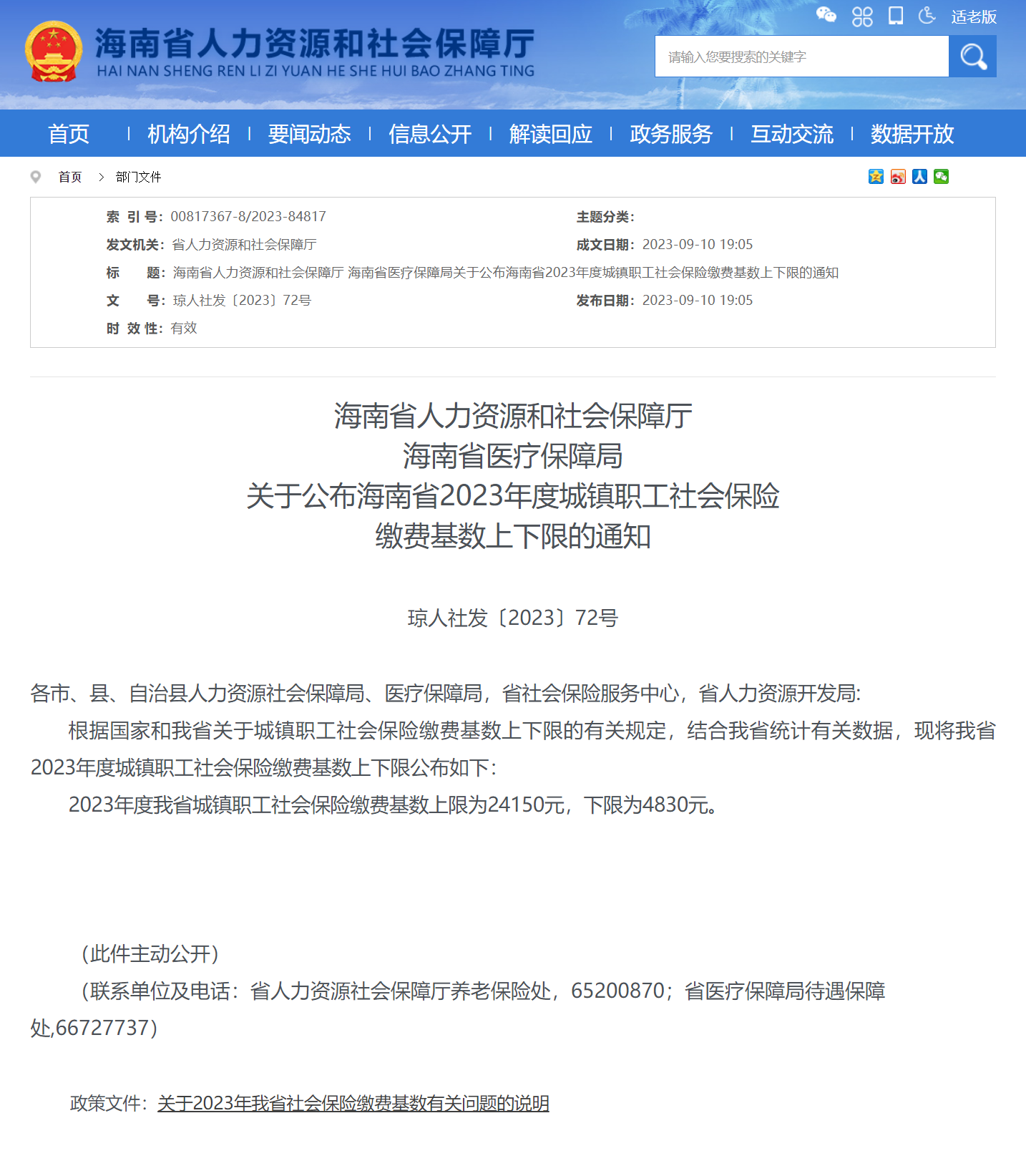 2023年海南社保繳費基數調整 上限24150元下限4830元