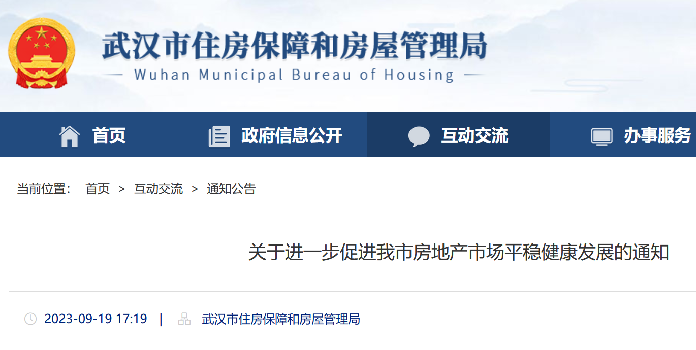 央廣網北京9月20日消息 據武漢市住房保障和房屋管理局網站消息,9月19日,武漢市房管局發布《關于進一步促進我市房地產市場平穩健康發展的通知》(以下簡稱《通知》),《通知》顯示,自2023年9月19日起,武漢市取消二環線以內住房限購政策,滿足居民剛性和改善性購房需求。