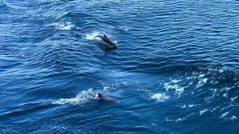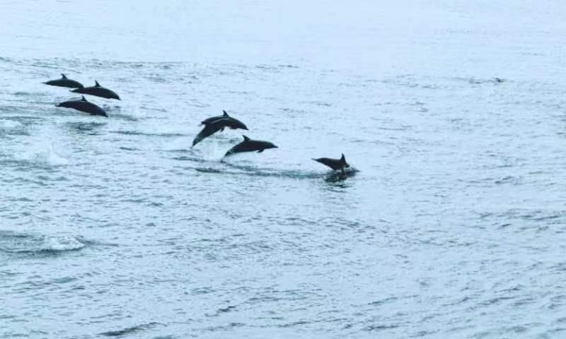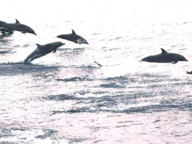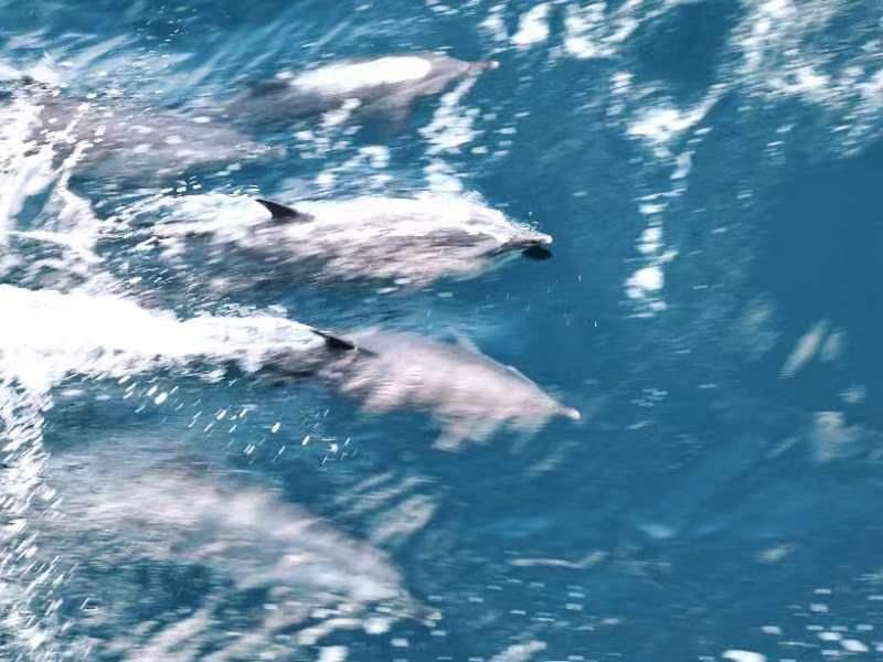 10月6日,海南三亞海警局千舟艦在三亞灣附近海域開展日常轄區巡邏任務時偶遇大批海豚,海警執法員為確保海豚群安全,隨即降低艦艇航速,并為海豚群護航,直至海豚群安全離開船只密集活動區域。(總臺記者 楊濤 王博豐)