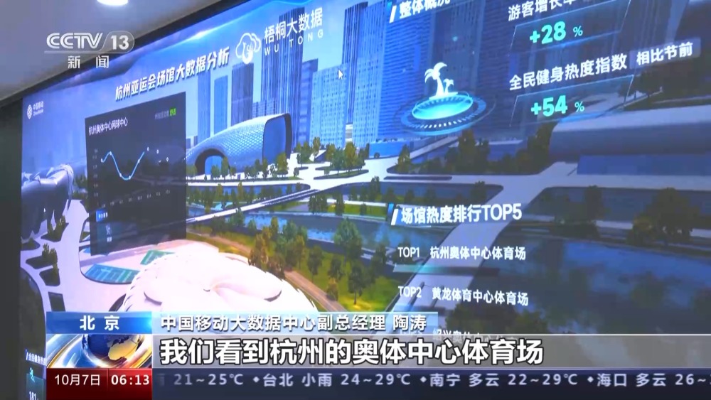 中國移動大數據中心副總經理 陶濤:前往亞運會主要舉辦城市的游客的數量相比節前一周日均增幅超過28%,主要是來自長三角地區以及津京冀等地區。根據我們對于線上訂票以及搜索這些數據的分析,我們看到杭州的奧體中心體育場、黃龍體育中心體育場以及紹興奧體中心體育館這三個場館是最熱的體育場館。