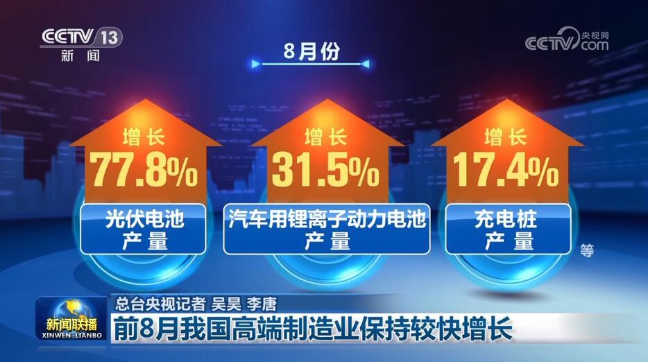 8月份,主要新能源產品兩位數增長,新能源汽車產量同比增長13.8%,帶動光伏電池、汽車用鋰離子動力電池、充電樁等產品產量分別增長77.8%、31.5%、17.4%;新材料產品生產保持高速增長,太陽能工業用超白玻璃、多晶硅、單晶硅等產品產量分別增長63.3%、84.6%、79.9%。