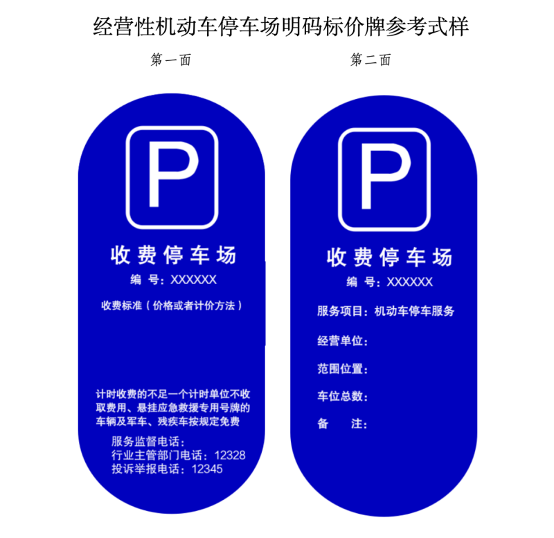根據相關法規政策的新要求,按照依法合規、便民利民、不做大改的原則,征求意見稿對兩種機動車停車場明碼標價牌參考式樣進行了修改完善,并附上“經營性機動車停車場明碼標價牌參考式樣”和“道路電子收費停車場明碼標價牌參考式樣”,供相關單位參照自行制作明碼標價牌,明碼標價牌編號為北京市公共停車場經營備案證的備案號。