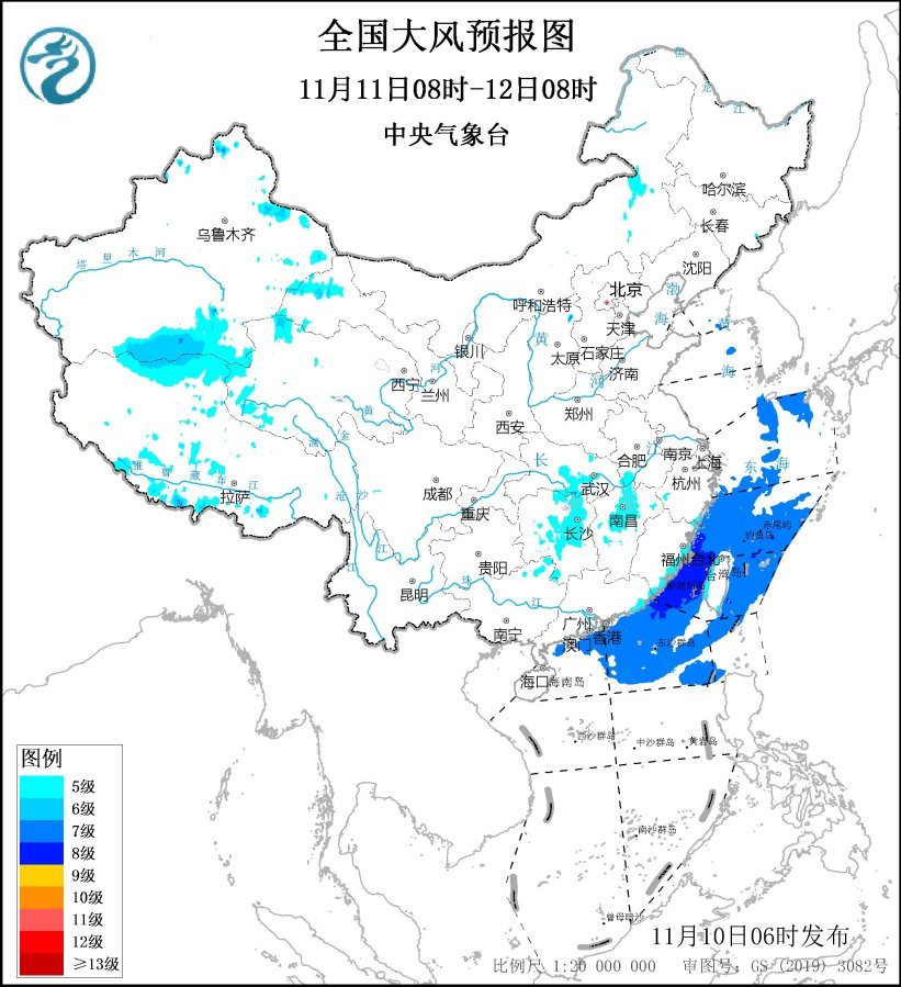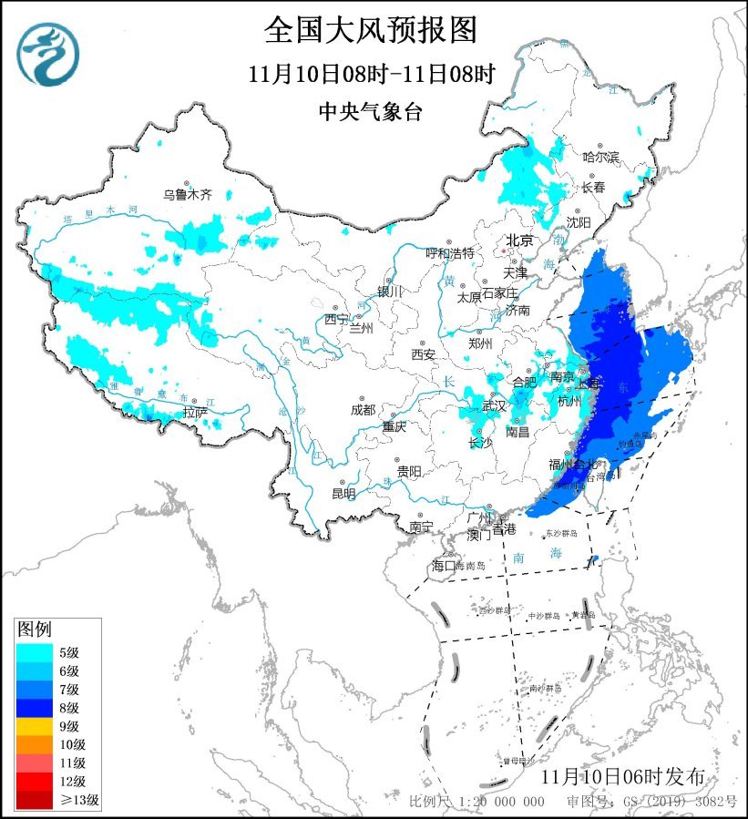 預(yù)計(jì),11月10日08時(shí)至11日08時(shí),內(nèi)蒙古中東部、遼寧西部、安徽中南部、河南南部、江蘇南部、上海、湖北南部、湖南東北部、江西北部、浙江北部及東部沿海、福建沿海、臺(tái)灣島沿海等地有5~6級、陣風(fēng)7~8級的大風(fēng);黃海大部海域、東海大部海域、臺(tái)灣海峽、臺(tái)灣以東洋面偏北海域、南海東北部偏北海域?qū)⒂?~8級、陣風(fēng)9~10級的大風(fēng)。