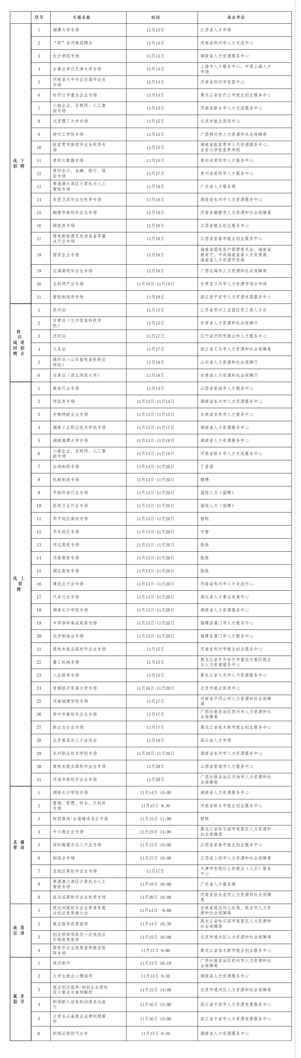 央廣網北京11月15日消息(記者 馮儀)人力資源和社會保障部2023年大中城市聯合招聘高校畢業生秋季專場活動近期將推出第四批共77場特色服務活動。包括智能制造類、互聯網產業、陶瓷類等21場線下專場招聘會,6場跨區域巡回招聘會,教培行業、生物制藥、機械制造等31場線上專場招聘會,9場直播帶崗活動,4場政策宣講直播(錄播)課以及6場就業指導直播(錄播)課。