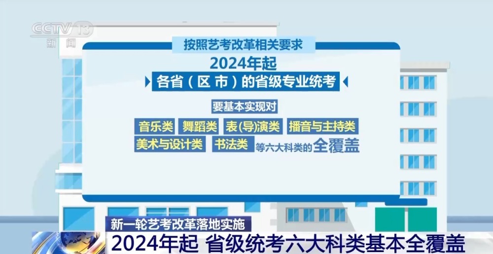 按照藝考改革相關要求,2024年起,各省(區、市)的省級專業統考要基本實現對音樂類、舞蹈類、表(導)演類、播音與主持類、美術與設計類、書法類等六大科類的全覆蓋。戲曲類實行省際聯考。對于考試組織確有困難的個別科類,有關省份可通過省際聯考或“考評分離”等方式實施。據介紹,上海市已按照最新要求,對藝術類專業統考進行了調整。