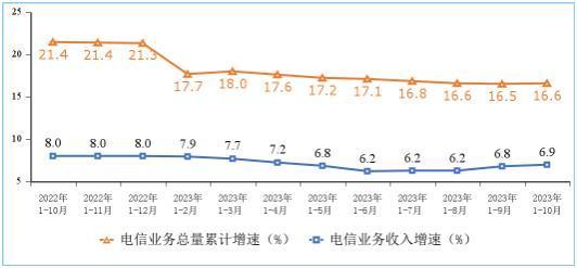 電信業務量收均實現小幅提升。1—10月份,電信業務收入累計完成14168億元,同比增長6.9%,增速較前三季度提升0.1個百分點。按照上年不變價計算的電信業務總量同比增長16.6%。