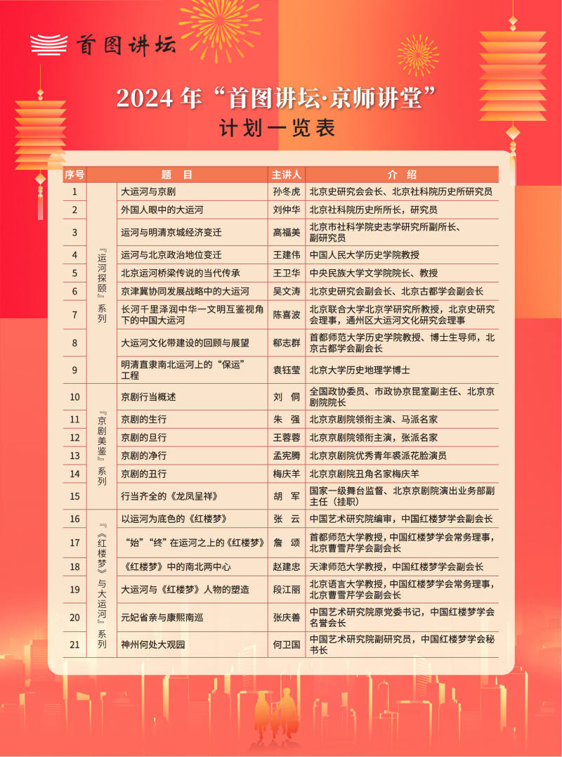 北京史研究會會長孫冬虎發布“京師講堂”2024年度主題講座計劃。全年近50場講座,包括北京胡同四合院、三山五園、明清北京商業、龍年說龍等歷史文化與社會生活主題,還有四項專題系列講座——“運河探頤”系列將以大運河的歷史變遷與運河文化的挖掘、研究、傳承為焦點,展示北京城市發展與大運河的密切關系;“京劇美鑒”系列致力于讓聽眾體味京劇國粹的獨特風韻與文化價值;“《紅樓夢》與大運河”系列將挖掘《紅樓夢》與世界文化遺產大運河之間的密切關聯;“清朝宮廷”系列將還原清代宮廷生活的真實場景,提升聽眾關于清代歷史與文化的準確認知。