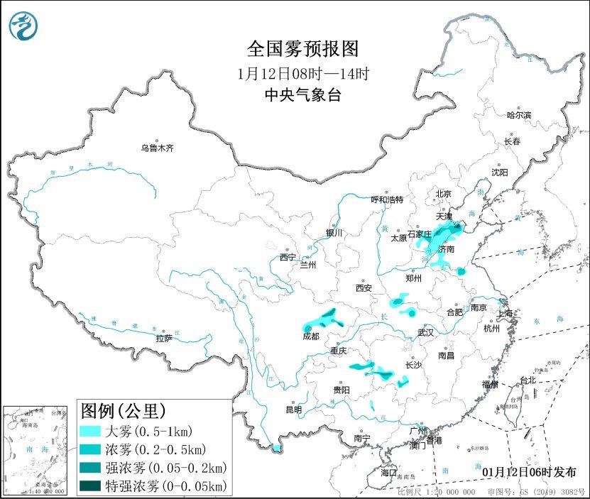 央視網消息:中央氣象臺1月12日06時繼續發布大霧黃色預警:預計,1月12日的早晨至上午時段,河北南部、山東北部和西部、湖北北部、四川盆地北部、湖南西部、貴州東部等地的部分地區有大霧天氣,其中山東西北部、四川盆地北部、湖北北部、湖南西部、貴州東北部等地的部分地區有能見度不足500米的濃霧,局地有能見度不足200米的強濃霧。