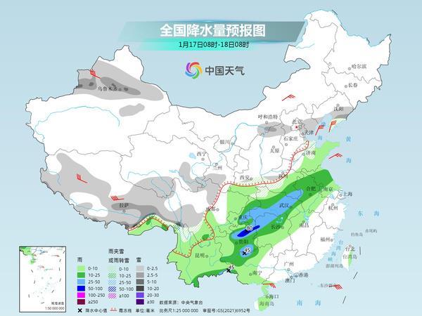 后天,新疆沿天山地區、內蒙古中部偏南地區、西藏中南部、青海南部、甘肅南部、遼寧南部、山東北部、陜西南部、河南西部、云南西北部等地的部分地區有小到中雪或雨夾雪;其中西藏東部、云南西北部等地局地大到暴雪;西南地區東部、黃淮中南部、江淮、江漢、江南北部和西部、華南西部、云南等地部分地區有小到中雨,其中重慶東南部、河南東南部、湖北東部和南部、湖南西北部、貴州中東部、云南東南部等地的部分地區有大雨,局地暴雨。