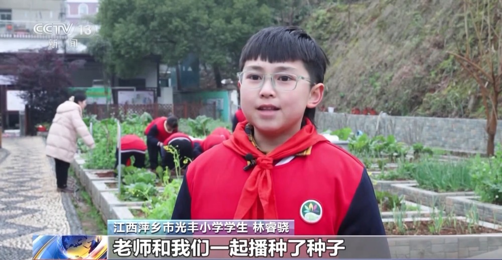 在江西萍鄉,光豐小學的老師將新學期的第一課放到了室外,孩子們來到菜園實地觀察各種農作物,將手中的蔬菜種子播撒在土地里,親身體驗勞動的過程。