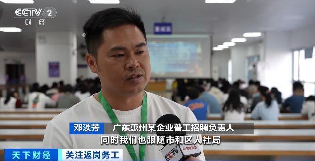 廣東惠州某企業普工招聘負責人 鄧淡芳:我們企業在初四就已經開始正常招聘了,同時我們也跟隨市和區人社局,在初七的時候就開始走出去了,去了云南、湖南。