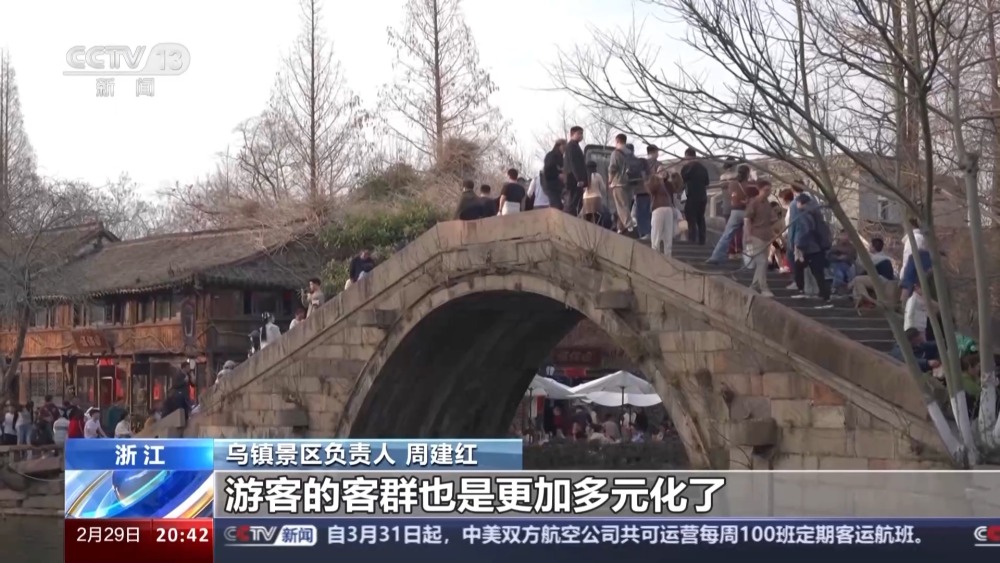 烏鎮景區負責人 周建紅:二月份來看,我們整個線上營銷比例已經超過了線下,占比達到了60%,旅游產品也是在做不斷的一個迭代,游客的客群也是更加多元化了。十年前的春節,游客量在20多萬,那這一次的春節的話,我們已經是突破了50萬人次,也是翻倍的一個增長。
