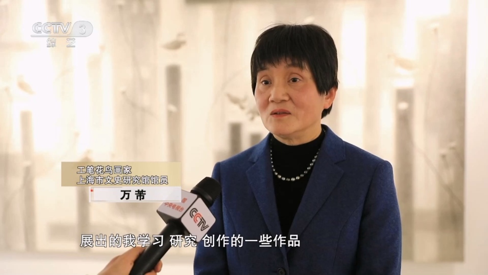 工筆花鳥畫家 上海市文史研究館館員 萬芾:實際上展覽的這個時間度是跨越了有四十多年,展出的我學習、研究、創作的一些作品。我是和策展人一起商量,把自己從學習到成為一個女性藝術家這個經歷做一個梳理,以及我畫的一些跨界的一些創作,甚至還有我和學生合作的一些衍生品,這是三個部分,完全不一樣的內容來展現給大家。