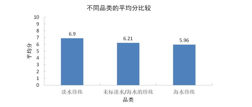③珍珠飾品品類比較:對購買樣品按產品分類進行橫向打分比較,平均得分由高至低分別為:淡水珍珠6.9分、珍珠(未標識淡水或海水)6.21分、海水珍珠5.96分。