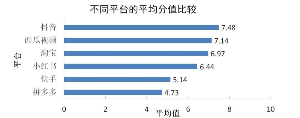 ①平臺比較:本次調查對買樣數超過五件的平臺進行橫向打分比較,平均得分由高至低分別為:抖音7.48分、西瓜視頻7.14分、淘寶6.97分、小紅書6.44分、快手5.14分、拼多多4.73分。