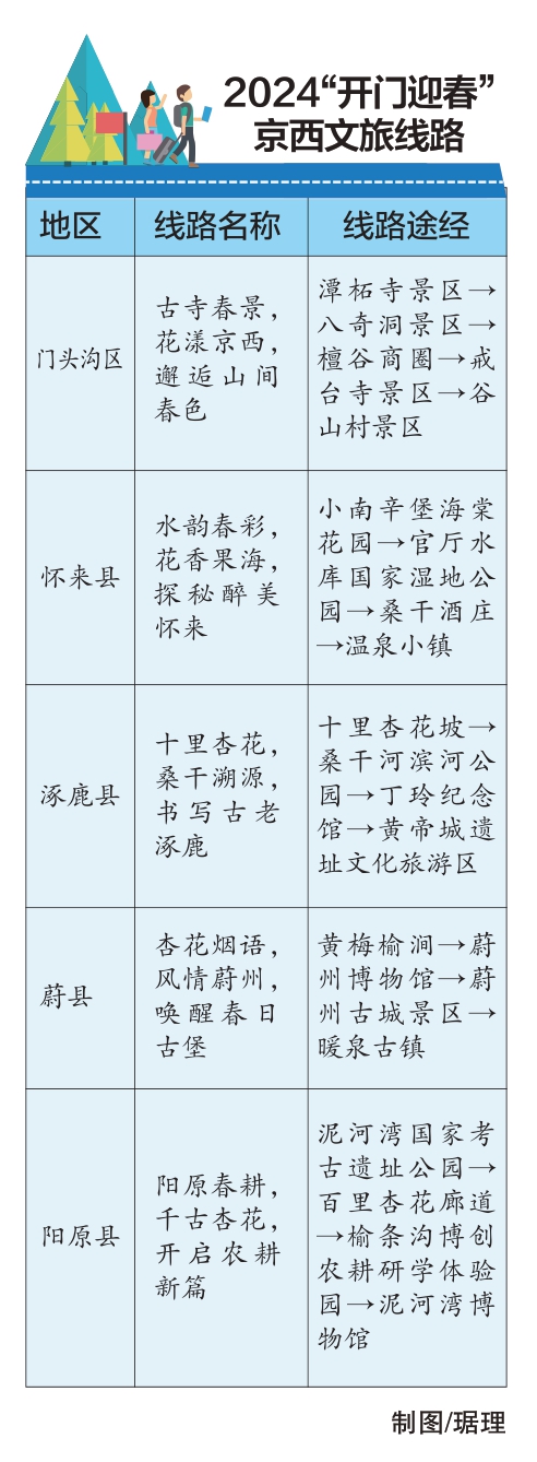 門頭溝區聯動河北省張家口市懷來縣、涿鹿縣、蔚縣、陽原縣共同發布“詩畫京西春暉行”五條春游線路,圍繞踏青、賞花、徒步、騎行、露營、微度假等元素展開,為促進京津冀消費和北京一季度“開門紅”提供助力。