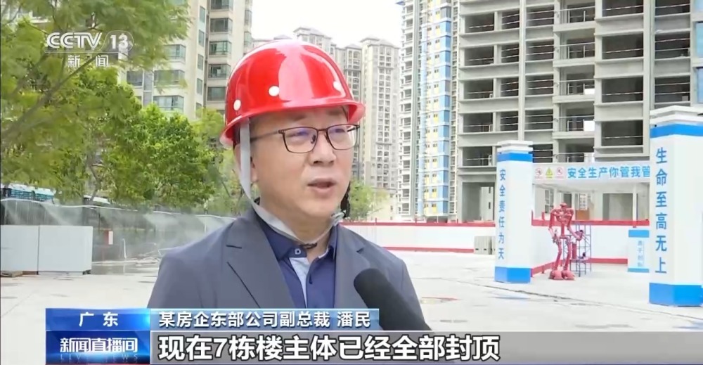 某房企東部公司副總裁 潘民:現在7棟樓主體已經全部封頂,正在進行批量精裝修階段,我們都是按照計劃實施,按合同按合約交付,第一批次是在2025年的8月份交付。