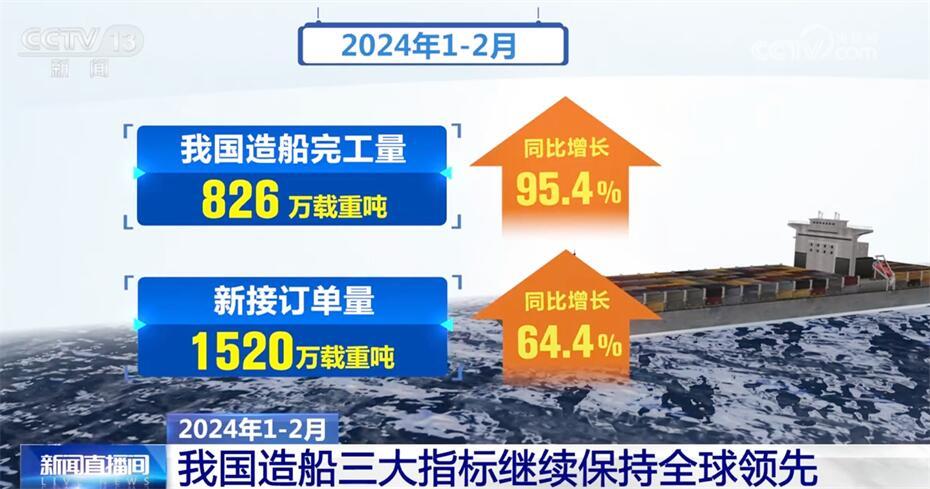最新數據顯示,2024年1—2月,我國造船完工量826萬載重噸,同比增長95.4%;新接訂單量1520萬載重噸,同比增長64.4%;截至2月底,手持訂單量14919萬載重噸,同比增長31.3%,造船三大指標國際市場份額繼續全球領先。
