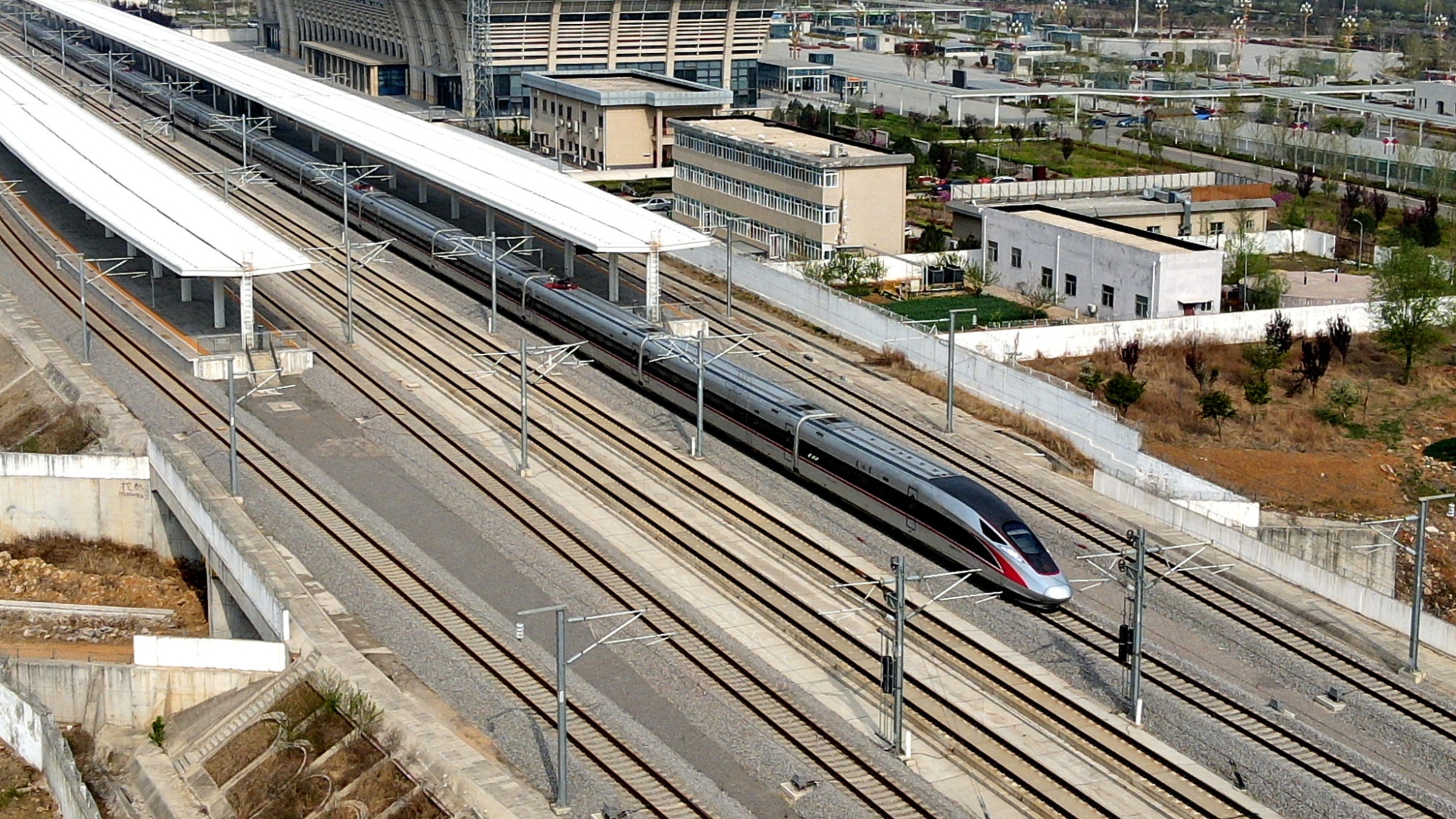 2024年4月9日,山東臨沂,一列動車組列車駛出蒙山站。