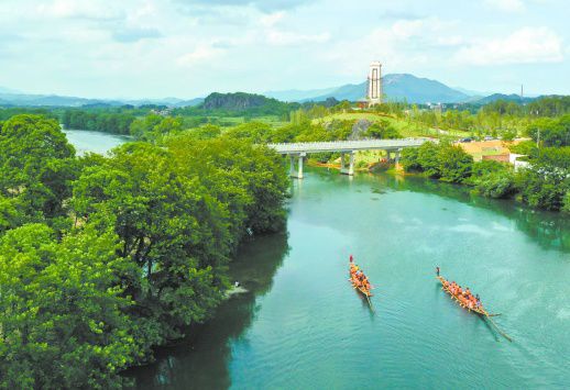 5月26日,道縣洑水河梅花貴頭段,村民在河面上劃龍舟。近年,道縣堅持以生態立縣,實施退耕還林、封山育林、水土保持、礦山植被修復等生態工程,不斷擴大森林面積,提高水源涵養能力,全縣生態持續向好,呈現出“河清、岸綠、景美”的生態景觀。(蔣克青 雷伙生 攝影報道)