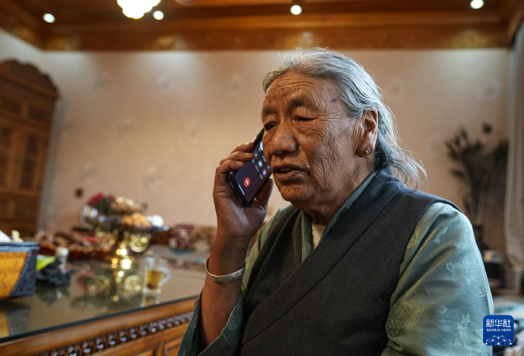 格桑玉珍用手機與好友通話(4月3日攝)。新華社記者 晉美多吉 攝