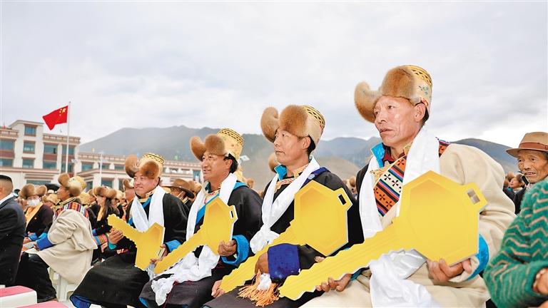 搬遷群眾代表們手捧新房“鑰匙”。記者 丹增平措 攝
