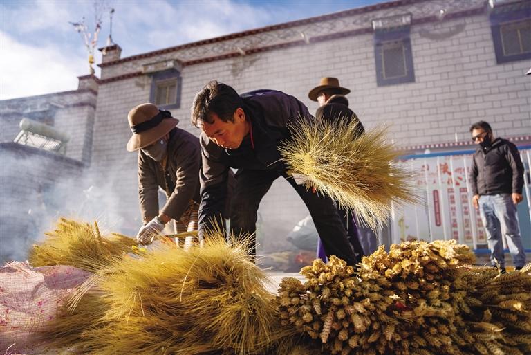 走進桑木村,房屋錯落有致,廣場上,村民們在冬日暖陽下忙碌著。有的正在煮顏料為麥穗和青稞穗上色,有的正在捆綁曬干的“羅薩梅朵”。“為了方便制作,我們根據外形給這些麥穗和青稞穗起了名字,比如這個禿禿的叫‘古日’,這個最長的叫‘扎日’,還有‘阿索’和‘梅朵’。”64歲的村民其米卓嘎與幾位姐妹圍坐在一起,一邊捆綁“羅薩梅朵”,一邊笑著向記者介紹,手上動作絲毫未停。“很多人過年講究儀式感,會選擇買齊這四種,但大部分人會從中選兩種。”