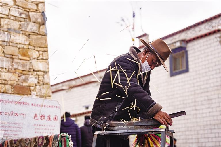 每年12月起,桑木村處處可見“羅薩梅朵”。清晨,天還未亮,村民們就已忙碌起來。有人將制作好的“羅薩梅朵”打包送往拉薩市區售賣,有人則繼續為剩下的麥穗和青稞穗上色、曬干。“我從小看著長輩們制作‘羅薩梅朵’,7歲就開始幫忙捆綁,20歲開始獨立制作。每到這個時候,我就知道新年快到了。”64歲的村民卓瑪次仁回憶道。